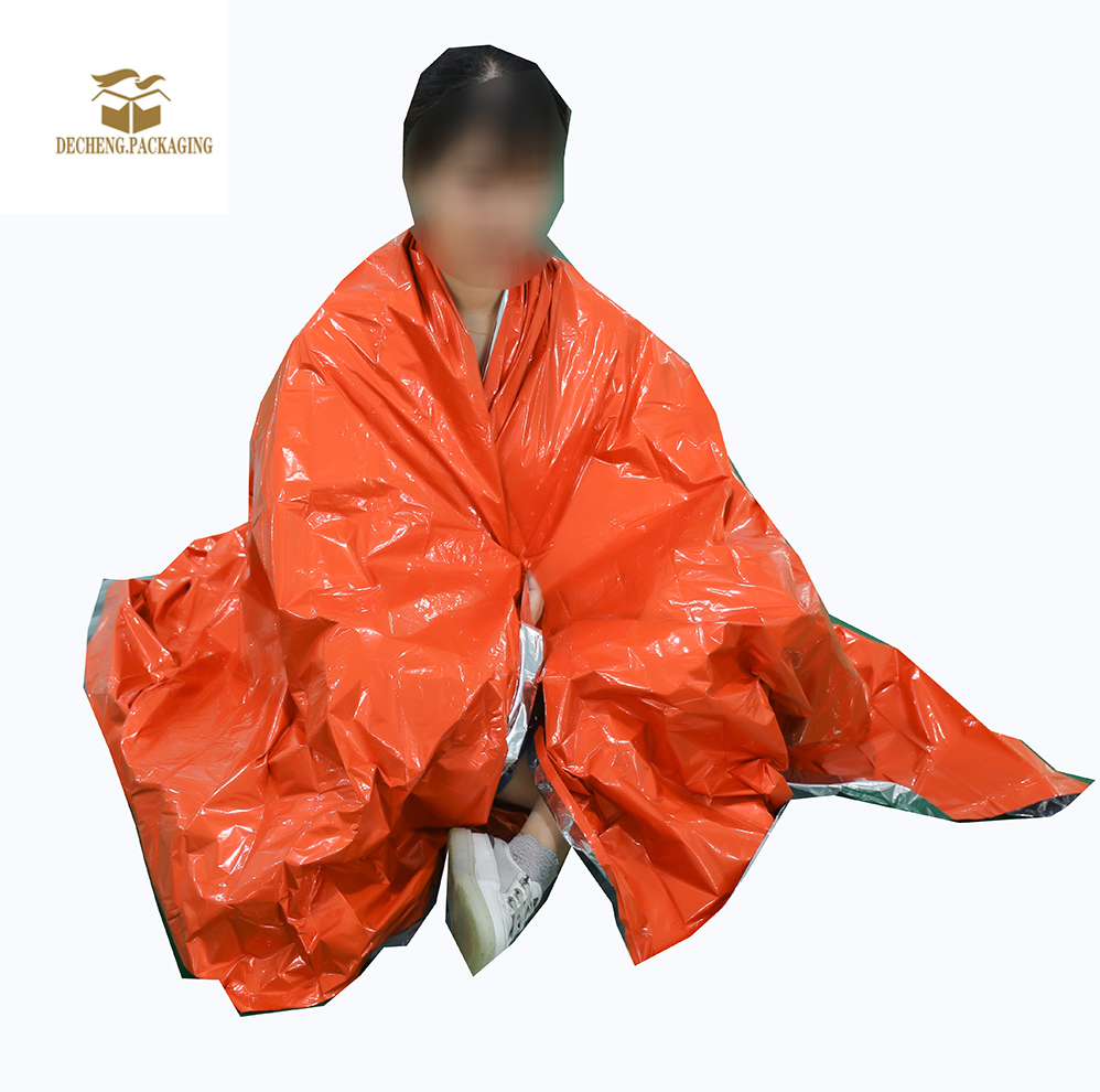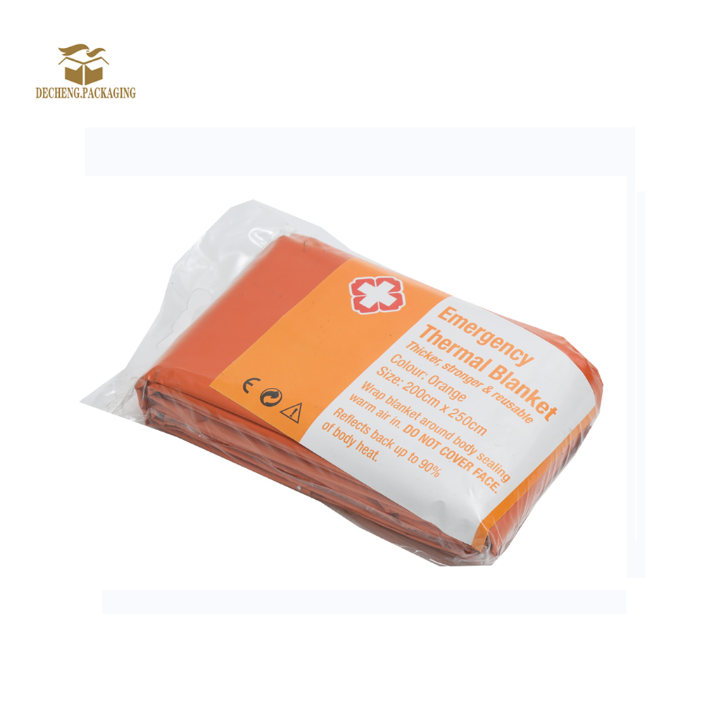 Decheng Orange Thermal Blankets Quick Detail: 1. Different names of products: Thermal BlanketRescue Insulation Curtain First Aid Foil Blanket Survival Blankets Heavy Duty Camping Gear 2. Main uses: The main function of emergency insulation blanket is to maintain body temperature, prevent shock, and save precious time for saving lives and waiting for rescue. Description Place of Origin: Jiangyin, Jiangsu, China Brand Name: Decheng Model Number: TBO Certification: ISO 9001, SGS, REACH Minimum Order Quantity: 1000 pieces Price: / Packaging Details: pieces customizable Delivery Time: 7-15days Payment Terms: T/T, L/C Supply Ability: 500,000 pieces per month Company Description: Jiangyin Decheng Packaging Materials Co., Ltd., located in the economically vibrant Jiangyin City, Jiangsu Province, is a professional flexible packaging company specializing in R&D, slitting, and bag making. With multiple state-of-the-art flexible packaging production lines,…