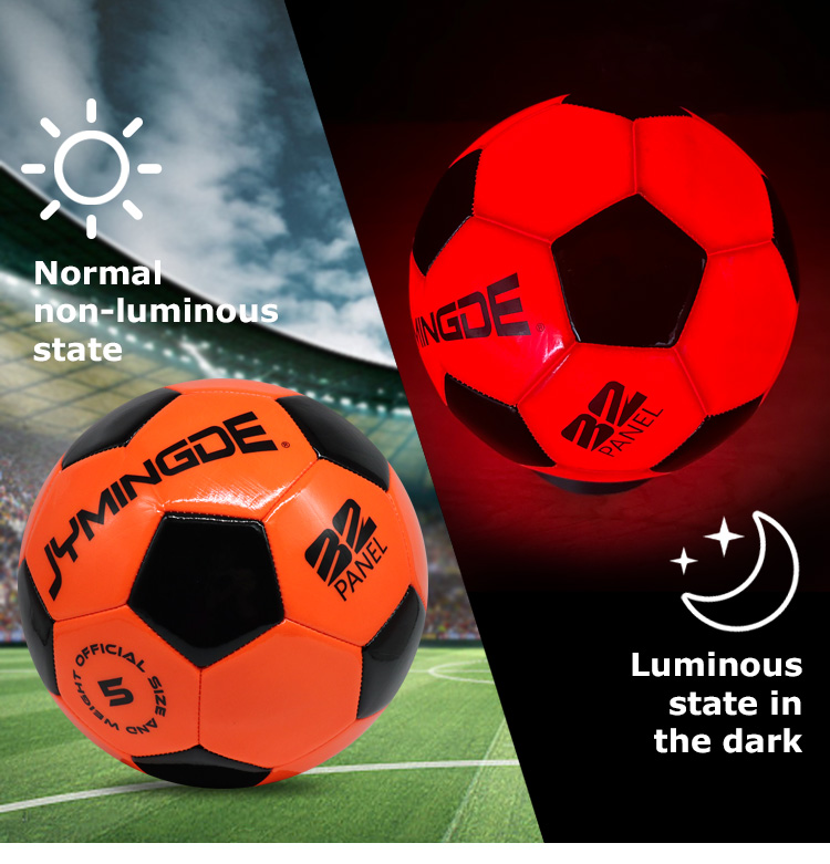 This is an orange and black luminous football product. This product has been very popular on the Amazon platform recently. Our football contains bladder and outer leather, using machine sewing and manual sewing technology. The stitching of the football is very tight, which ensures the quality of the football to a certain extent. In addition, the luminous football contains an LED light set, which makes the ball It will emit light when it collides, so that the use environment of the football is not limited to daytime. This luminous football can not only be used for youth training, but also can be given as a gift to teenagers. We provide football bags, charging cables, Air pump, a gift box. Our factory has a 40-year history of making balls, including soccer ball, basketball, volleyball, and customized designs.And we also have relatively mature production technology in the field of luminous balls. We not only have luminous basketballs, luminous footballs, luminous rugby, etc., you onl…