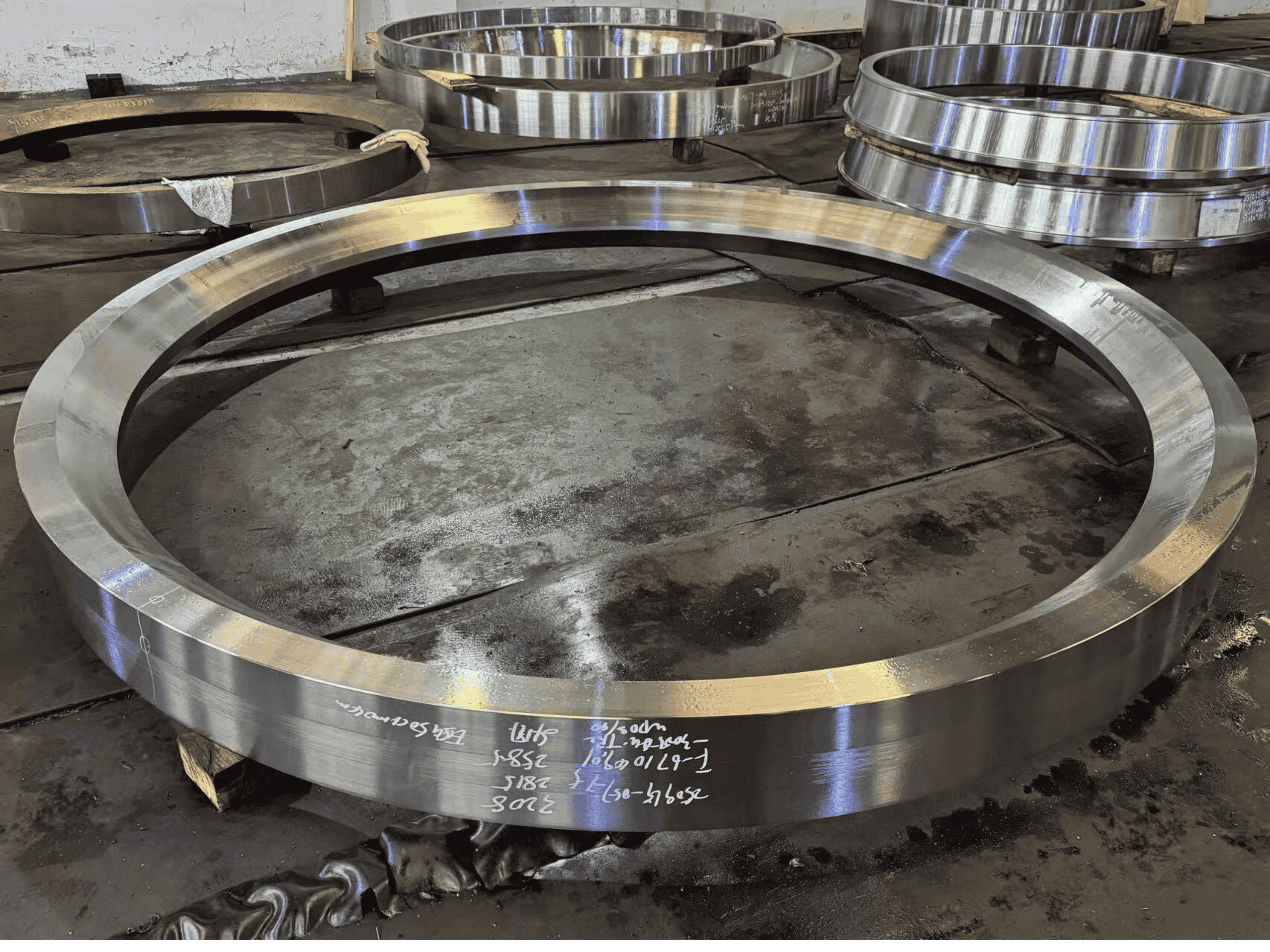 The double-row tapered roller bearing (TRB) is a high-precision rolling bearing designed to withstand large radial loads and bidirectional axial loads. Its internal configuration features two rows of symmetrically arranged tapered rollers, providing superior load-carrying capacity and rigidity compared with single-row TRB bearings. Our double-row TRB rings (inner & outer rings) are high-quality alloy bearing steel forgings, manufactured to achieve high dimensional accuracy, excellent fatigue resistance, and long service life. These bearing rings ensure stable operation under heavy-load, impact, or low-speed conditions, making them ideal for wind turbines and other heavy industrial machinery. Manufacturing Process & Quality Control We follow a strict manufacturing and quality inspection process to guarantee the integrity and performance of every bearing ring: Incoming Material Inspection Blank Cutting Ring Rolling Post-Forging Inspection Normalizing + Annealing Heat Treatment…
