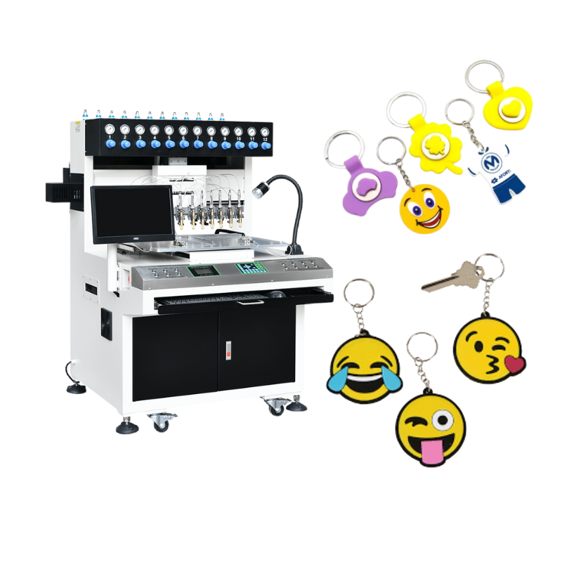 12 colors rubber keychain making machineThis Keychain Making Machine is mainly used for producing PVC soft rubber keychains, garment labels, shoe labels, coasters, and other PVC products. It can automatically dispense liquid PVC accurately into aluminum molds. Product Display Machine Front View Sample PVC Soft Rubber Keychains Technical Specifications 1:Model: WD 600V-12B ( use computer for programming), WD600E-12B ( use teach box for programming) 2:Suit material: liquid PVC 3:Color:12 4:Program:8 5:Running distance: X:580mm, Y:420mm, Z:45mm 6:Working tabel size: X: 640mm, Y:430mm 7:Servo system: AC servo motor 8:Transmission: Rolling srew drive 9:Working speed: 30000mm/min 10:Position Accuracy: 0.01mm 11:Analysis Ability:0.001mm 12:Discharging system: dispensing valve 13: Table Load: 5KG Key Features & Benefits Import JPG or DXF file to software to program dispensing track. Flexible programming method, can according to cu…