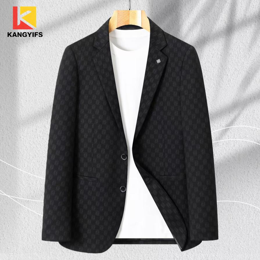 The black background with dark patterns fabric naturally exudes a trendy and cool vibe. The small checkered texture on the fabric surface integrates letter elements. From a distance, it appears as a high-end pure black, but up close, one can discover the design sense full of details. The touch is in season, soft and has a slight suede texture, which is suitable for the dressing preferences of young men. The classic flat lapel and two-button design have been specially adjusted for a "youthful" look: the collar width is 1cm narrower than that of traditional suits, making it look more neat and tidy. The shoulder line adopts the "slightly wide shoulder" technique, which can quietly modify the shoulder shape and create a relaxed contour with a "boyfriend style". The small metal logo on the left collar, with a silver glossy texture, contrasts with the dark patterns on the black background, adding a touch of refined detail to the trendy style. The bag-sticking design on both sides and the "s…