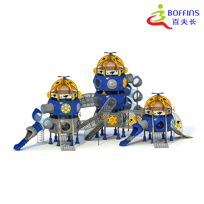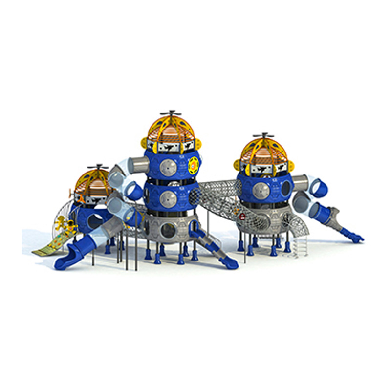This Galactic Dome Cluster Kids Outdoor Playground Set is an expansive, interconnected recreational solution designed for children aged 5 to 12, blending physical activity with cosmic adventure. Measuring 16701050740cm, its multi-dome layout (linked by netted climbing networks and winding slides) fits perfectly in community recreation parks, large backyards, and elementary school playgrounds—offering ample room for groups of kids to play collaboratively. Built for long-lasting outdoor use, the set features a robust, weather-resistant frame paired with smooth, child-safe materials that withstand sun, light rain, and frequent heavy use. Its bold blue, gray, and yellow color scheme, plus galactic details (like helicopter-topped domes, star accents, and interactive panel elements), evokes a sense of interstellar exploration, encouraging kids to pretend they’re navigating a cluster of space outposts while they climb, slide, and interact. Safety is embedded in every design choice: all ed…