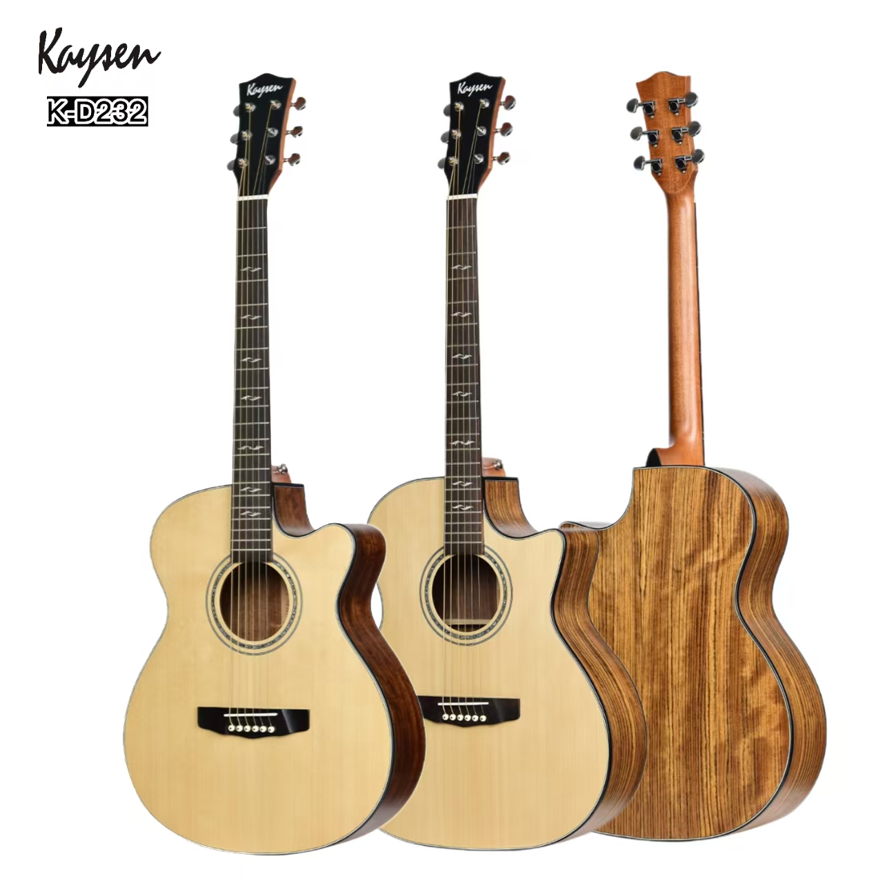 Kaysen guitar K-D232 is made of premium quality material. The top is made of solid spruce, back and side are walnut wood. It's 41 inch suitable for every guitarists. The fingerboard is made of rosewood and inlay with simple images to make whole guitar looks better. The 20 frets are round head design for more comfortable playing on this guitar. The neck is made of mahogany wood. On the rosette, there's real crushed shell. And with chrome die-cast tuning machine, guitar is more easier be tuned. The finish is matte but the surface of guitar is smooth. It's available that the guitar pickup can be installed before shipment. What's more, guitar bag, guitar capo, guitar strap, guitar tuner, guitar strings etc guitar accessories are supplied also. Brand Kaysen Model K-D232 Top Solid Spruce Back And Side Walnut Fingerboard Rosewood Frets 20F, round head design frets Finish Matte Head Machine Chrome Die-Cast Rosette Real Crushed Shell Customize Your Logo Accept…
