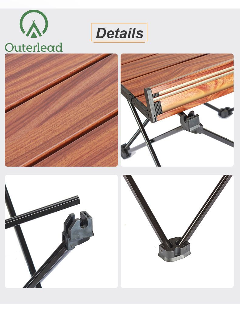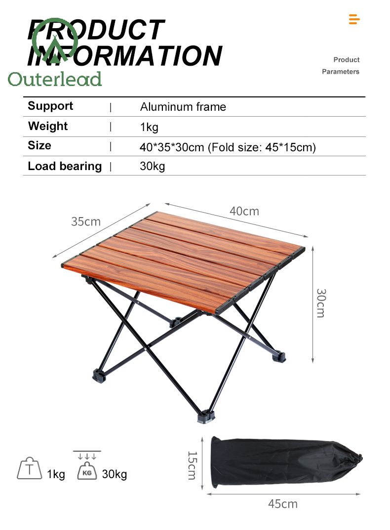 Introducing the Outerlead Folding Lightweight Wood Grain Mini Camping Table - the perfect addition to your outdoor adventures! Whether you're planning a picnic, car trip, fishing, camping, or traveling, this versatile table is the ideal companion. Crafted from high-quality wood grain aluminum, this mini camping table is not only durable and long-lasting but also visually appealing. Its compact size of 40x35x30cm makes it easy to carry, and it weighs just 1kg, so it won't add unnecessary bulk to your gear. Setting up this ultralight compact table is a breeze, and thanks to its unique hinged design connection, it will last for many years to come. Unlike other similar tables that use bungee cord connections, this table is built to withstand the rigors of outdoor use. Pair this table with our 2-person pop-up tent, lightweight camping chair, and portable charcoal barbecue grill, and you'll have everything you need for a comfortable and enjoyable outdoor ex…