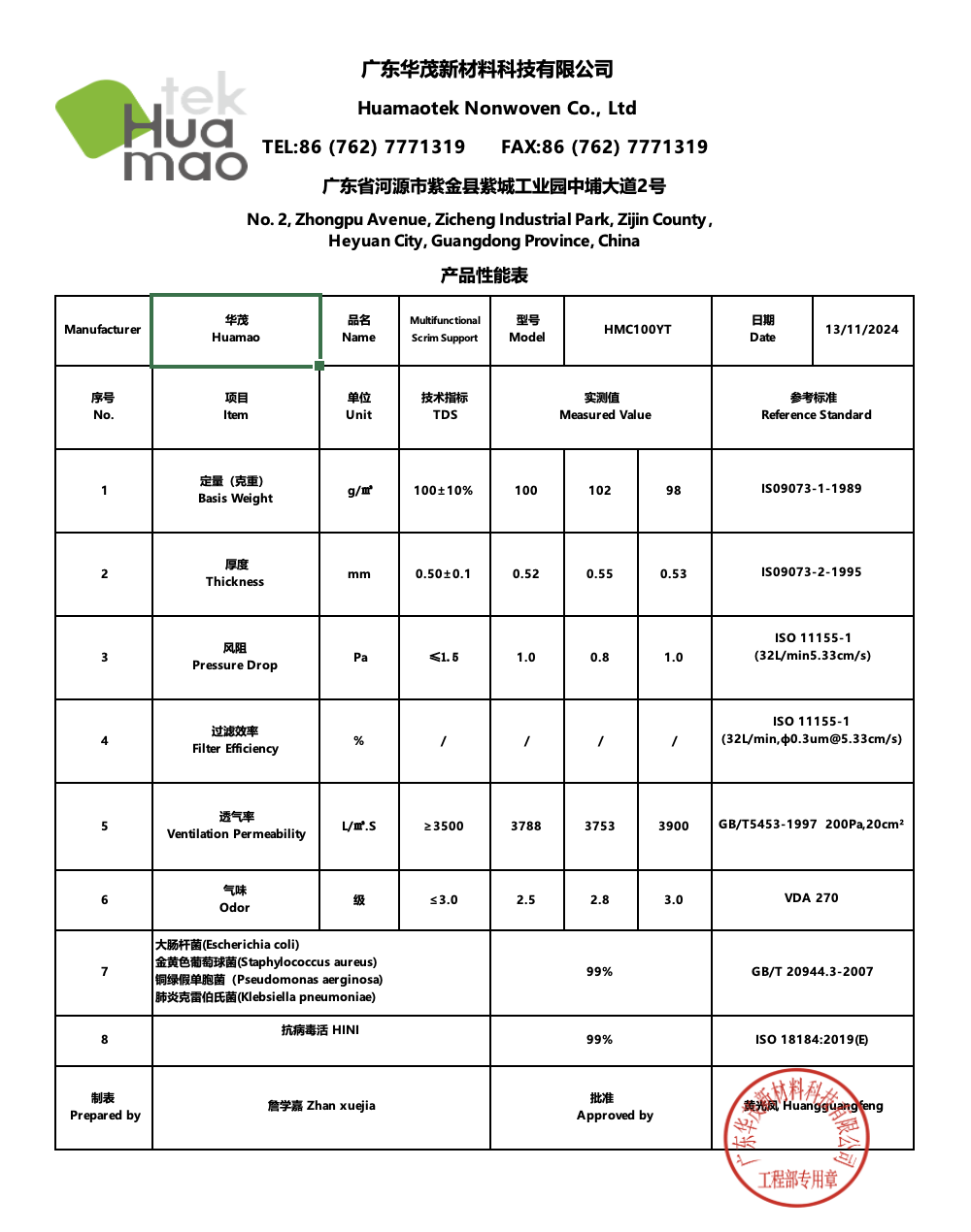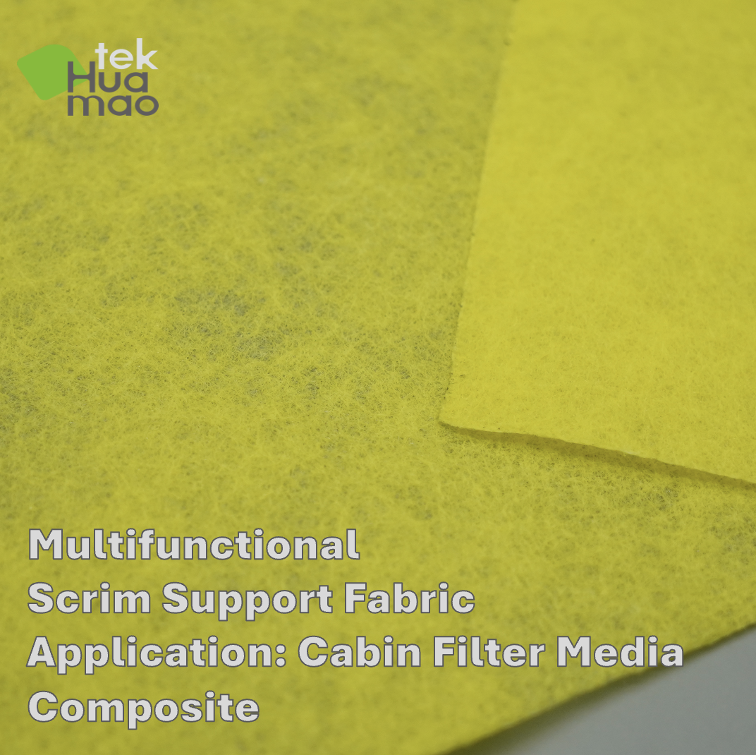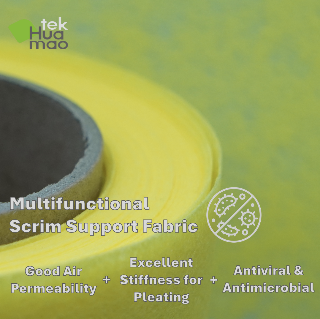 Multifunctional Scrim Support Fabric is a nonwoven fabric produced by Huamaotek, designed for application in automotive cabin filter media composites. This nonwoven fabric provides excellent stiffness during the pleating process and is widely used as one of the key layers in composite filter media. This scrim support fabric is manufactured using dry-laid thermal-bonded technology, delivering very good air permeability (>3500 L/m²/s) under low air pressure (<1.5 Pa). Its cross-lapping structure and rough surface offer better dust holding capacity compared to straight-lapped scrim support fabrics available on the market. Huamaotek’s dry-laid PET nonwoven scrim support fabric integrates effectively with antiviral (e.g., H1N1) and antimicrobial (e.g., Staphylococcus aureus, E. coli, Pseudomonas aeruginosa, Klebsiella pneumoniae) functions. This feature helps extend the filter media's lifespan and protects the end user's health. Huamaotek’s PET nonwoven scrim support fabric s…