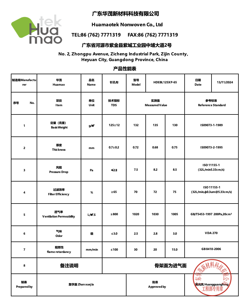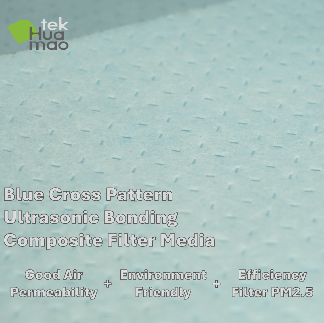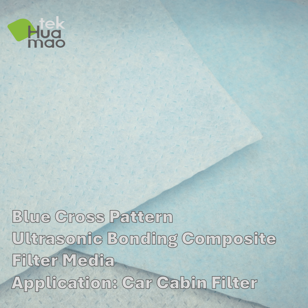 Huamaotek Blue Cross Diamond Pattern Ultrasonic Spot Bonding Cabin Filter Media is a standard OEM product widely used in Korean and Japanese car filters. This filter media is composed of a PET Nonwoven scrim support fabric and a 65% efficiency meltblown layer, which is highly effective in filtering PM2.5 pollutants. The ultrasonic spot bonding technology provides excellent air permeability, with results exceeding 1000 L/m²/s, and minimizes air pressure drop to less than 9 Pa. This is an adhesive-glue-free product, making it more environmentally friendly and highly stable in high-temperature environments. This product is a composite filter media that is complete and ready to use. Filter producers and manufacturers can use it to produce filters immediately. The product consists of two layers: Blue Color Dry-Laid Scrim Support LayerHuamaotek’s dry-laid scrim support layer features a cross-lapping structure and rough surface, providing excellent stiffness for the pleating proce…