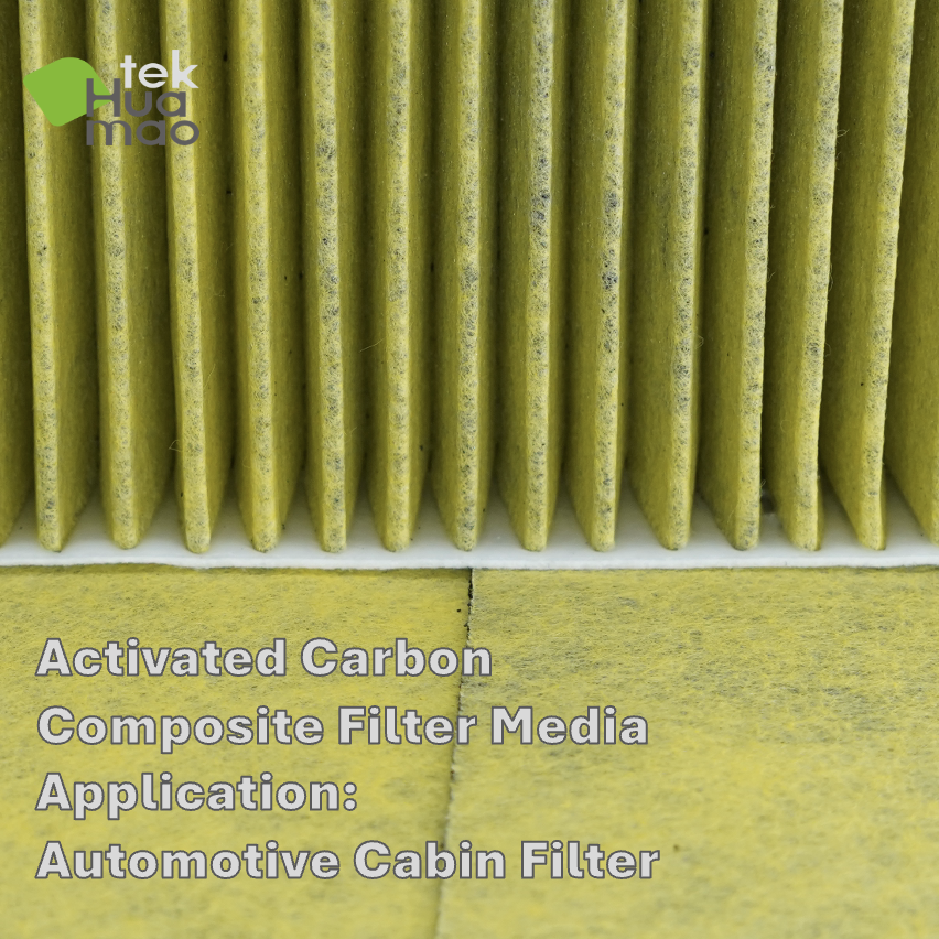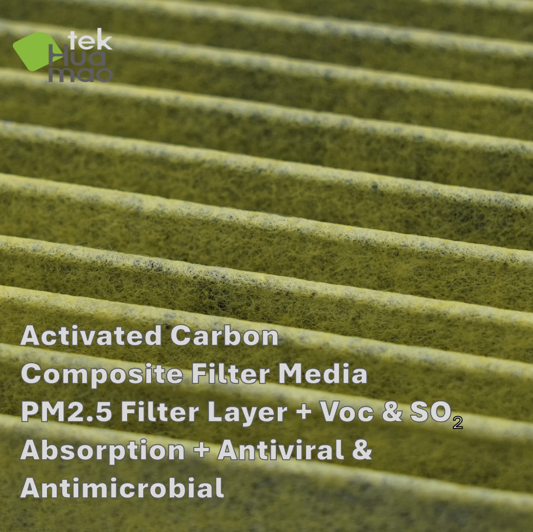 Huamaotek Carbon Series AC47 Yellow Colour Multifunctional Activated Carbon Cabin Filter Media is tailor-designed for one of China's largest car manufacturer OEM products. It fulfills requirements for efficiency rate, VOC & sulphur dioxide gas absorption, and offers multifunctional features such as antiviral and antimicrobial protection to safeguard end-user health in the car cabin during driving. This activated carbon filter media is a cost-effective, premium-grade product that is widely used in developing countries that heavily rely on petrol and fuel vehicles. It is highly effective in filtering PM2.5 pollutants and vehicle exhaust gases. AC47 Activated Carbon Filter Media Composite Fabric contains 4 layers: Yellow Colour Multifunctional PET Nonwoven Scrim Support LayerA high-stiffness dry-laid scrim support fabric that provides excellent pleating ability. Its rough surface increases dust-holding capacity. This scrim support fabric undergoes a special process with anti…